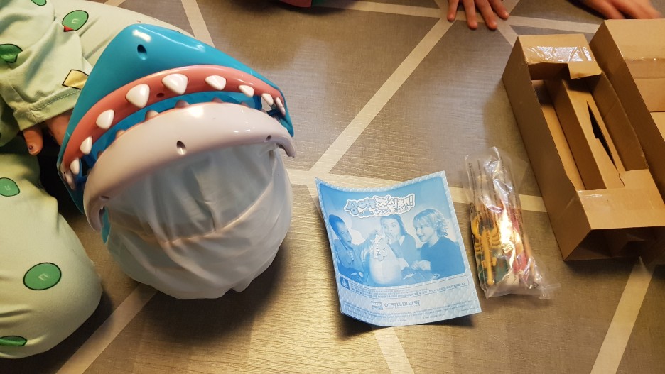 상어 한 마리, 물고기 들과 낚싯대 그리고 설명서,스티커가 들어 있습니다.
